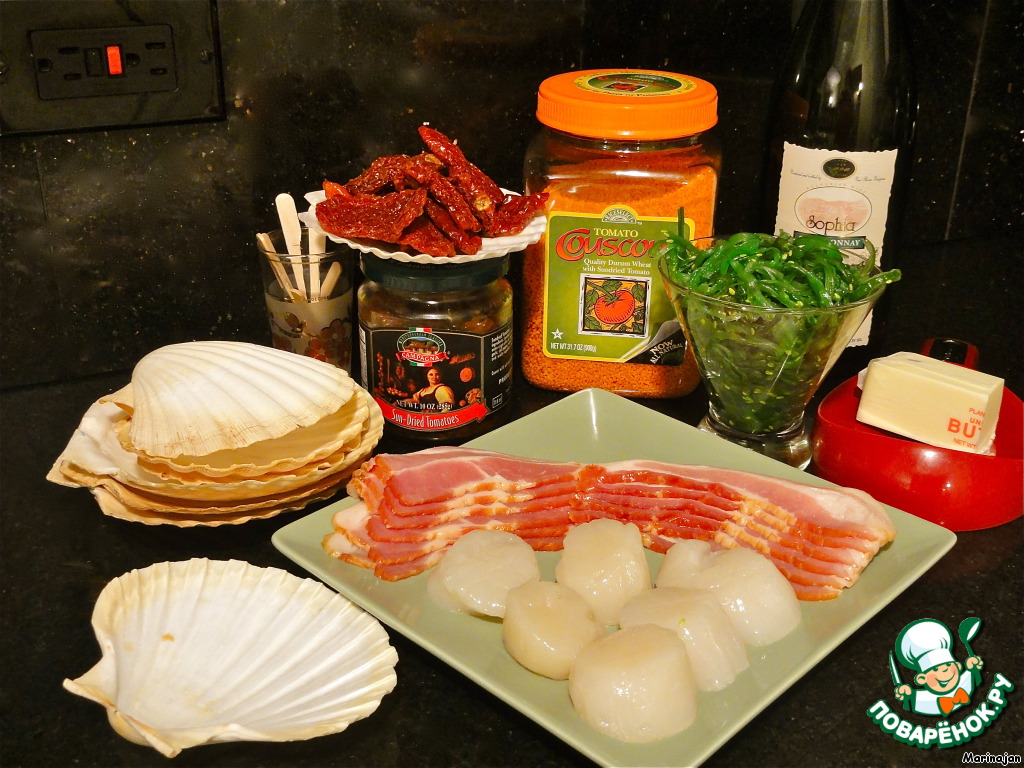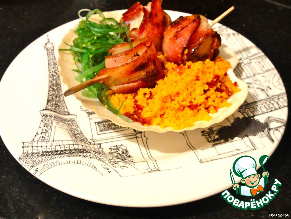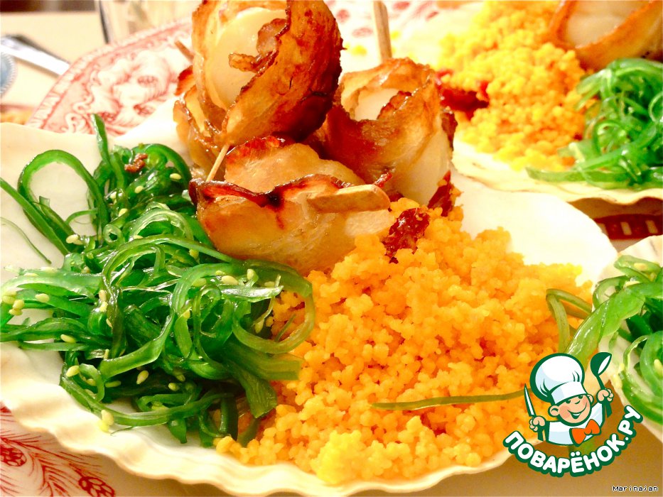 Кускус, морские гребешки выкладываем на раковину и украшаем морской капустой.