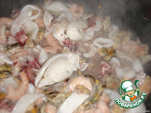 На разогретую сковороду наливаем немного оливкового масла и добавляем морской коктейль и тушим под крышкой.