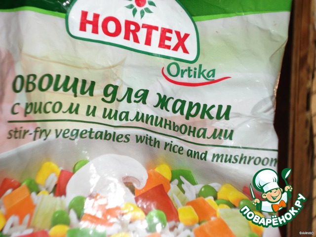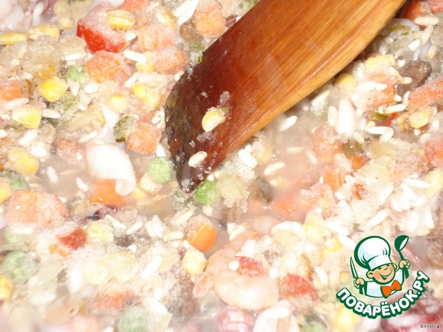 Берем замороженные овощи с рисом и добавляем в сковороду,перемешиваем,пдсаливаем совсем чуть-чуть.