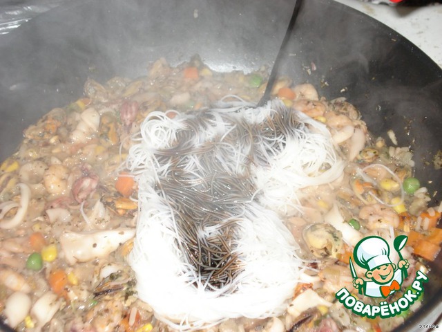 | Это блюдо для любителей тайской, китайской, японской кухни(но более тайской), в котором сочетаются морепродукты, овощи и рисовая вермишель. Это блюдо готовит моя дочь Олеся, это ее дебют на Поваренке. |