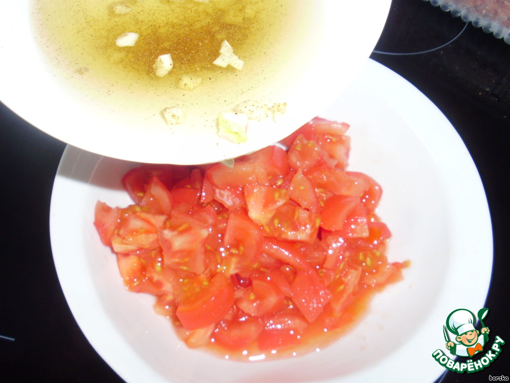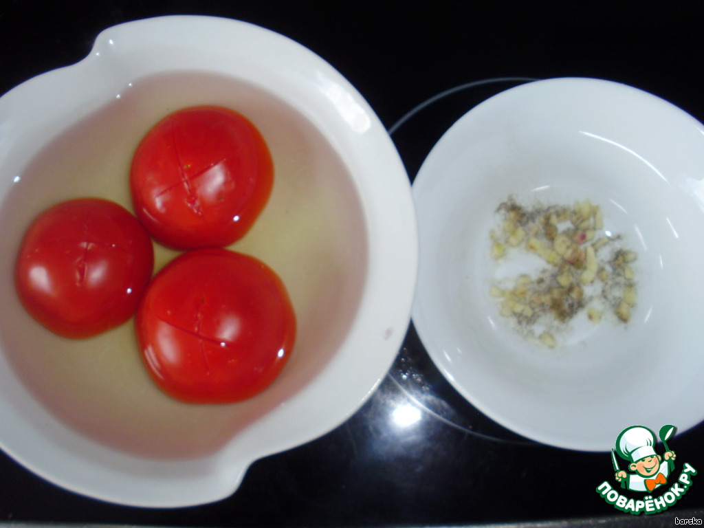 Помидоры надрезать, ошпарить, снять кожицу. Чеснок мелко порезать, добавить соль и перец