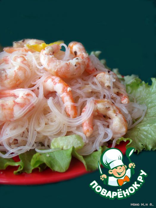 | Блюдо достаточно быстрое и несложное. Выбор пасты непринципиален – у меня была только фунчоза. Вообще же здесь креветки вышли в средиземноморском стиле, поэтому гарнировать лучше лингуине, спагетти |
