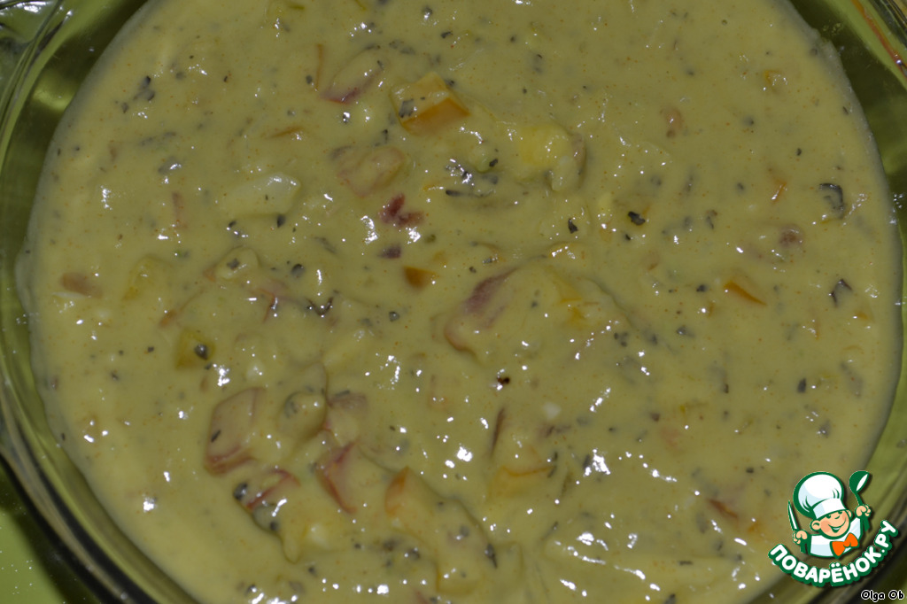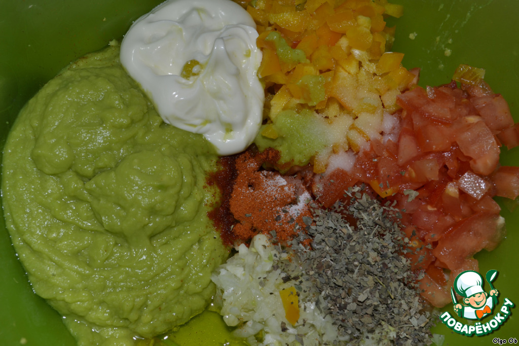 Вот все ингредиенты вместе. Добавляем чили перец, соль, столовую ложку с горкой майонеза (у меня был постный), я добавила еще 1 чайную ложку орегано. Все тщательно перемешиваем.