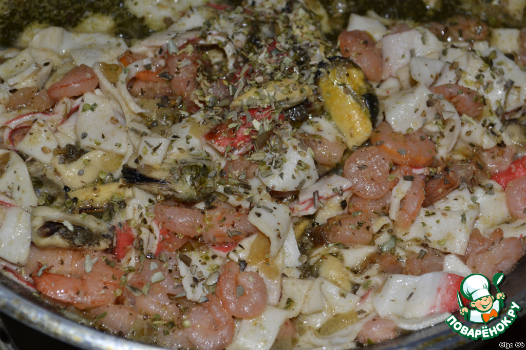 Потом морепродукты (или фарш, или овощи, в общем, основную начинку для тако, которую вы задумали). =)