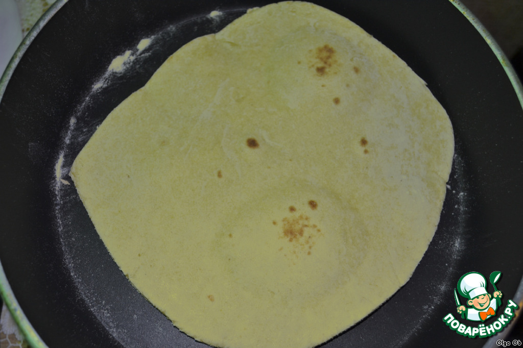 Шарики теста раскатываем и жарим на сковороде без масла. Жарятся очень быстро, буквально пару минут. Слегка румяним с каждой стороны и достаем. Сковороду нужно протереть от осыпавшейся муки перед следующей лепешкой.