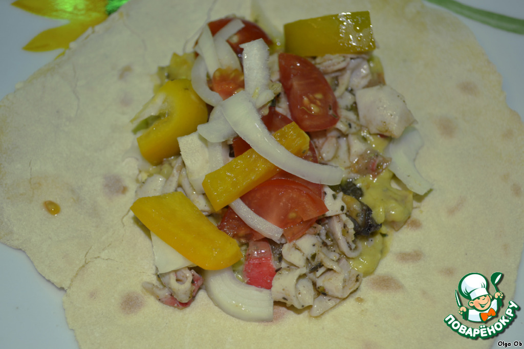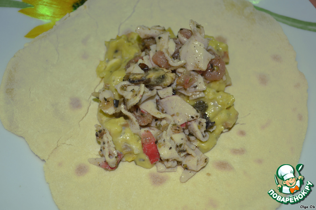 | Тако - блюдо мексиканской кухни. Кукурузная лепешка и многообразие начинок. Так как я на посту, себе делала овощное тако (соус сальса полностью из овощей), а вот гостям подавала с морепродуктами. =) |