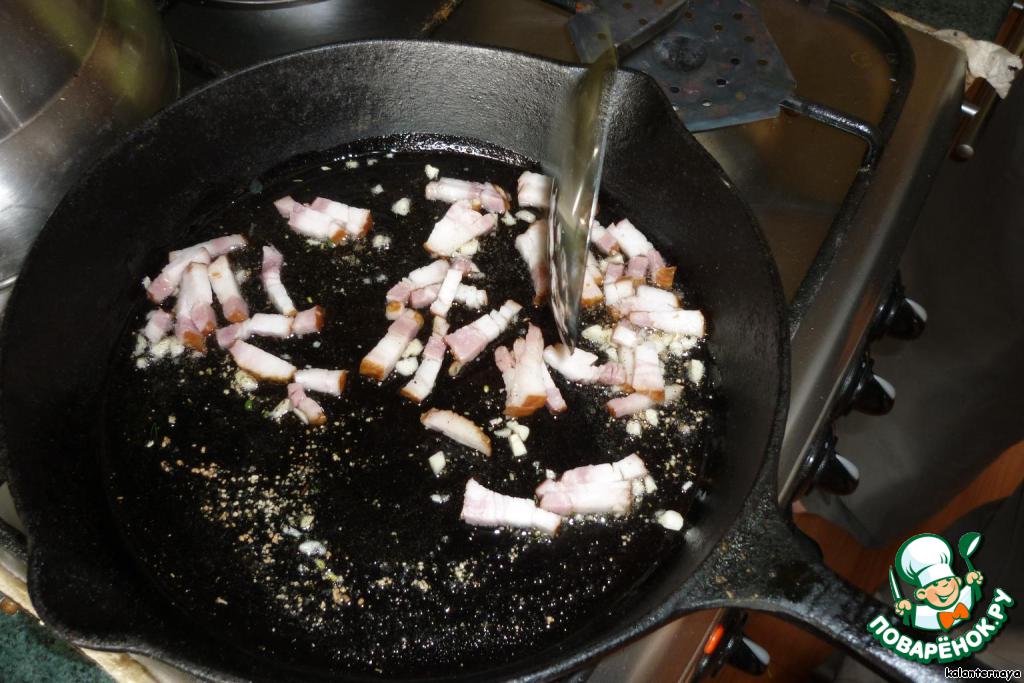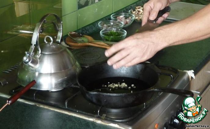 На сковороду - граммулечка масла, и греем в нем чеснок.