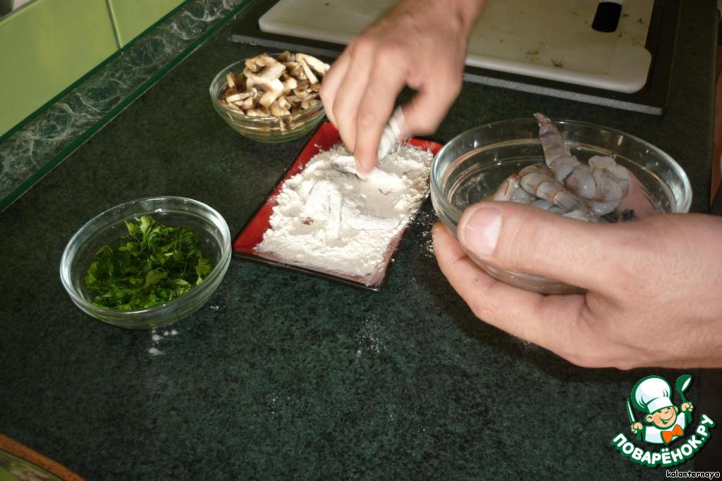 Подготавливаем все ингредиенты и раскладываем их по блюдечкам. Креветки очищаем от панциря. Режем мелко чеснок, в крайнем случае - трем на терку (только не давим, испортим весь вкус). Ставим греться на огонь сковороду.