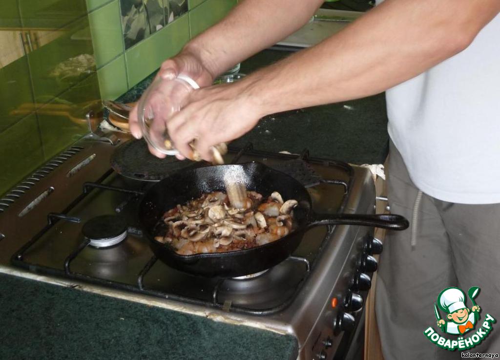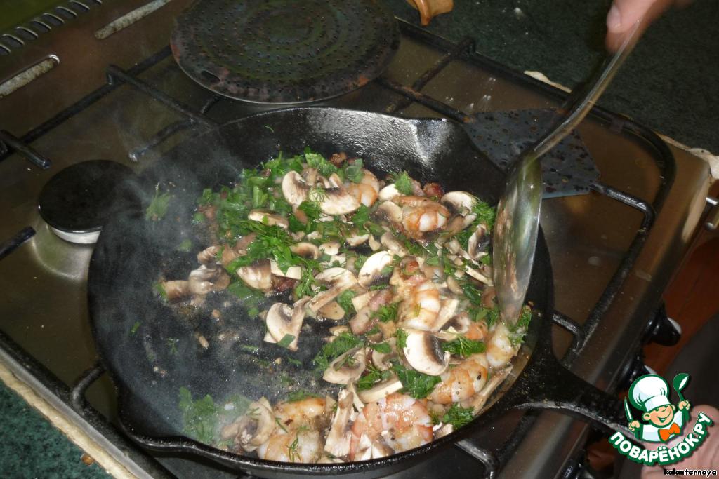 В подрумяненные креветки добавляем грибочки ломтиками.