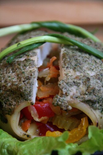 Нафаршировать кальмары овощной смесью, полить грибным соусом, поместить в ёмкость для запекания и поставить в разогретую до 200 градусов духовку на 15 минут.