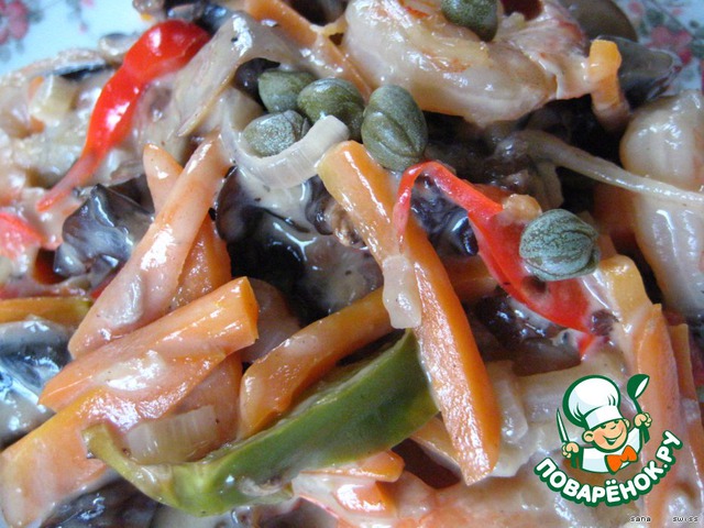 добавим муку, креветки, вино, сливки, каперсы, соль и перец, потушим еще около 5 мин., снимаем с огня и подаем.