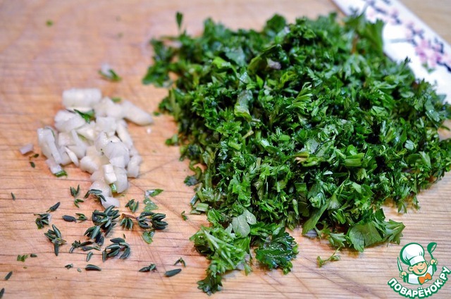 Зелень и чеснок нарежем, с тимьяна оборвём листики.