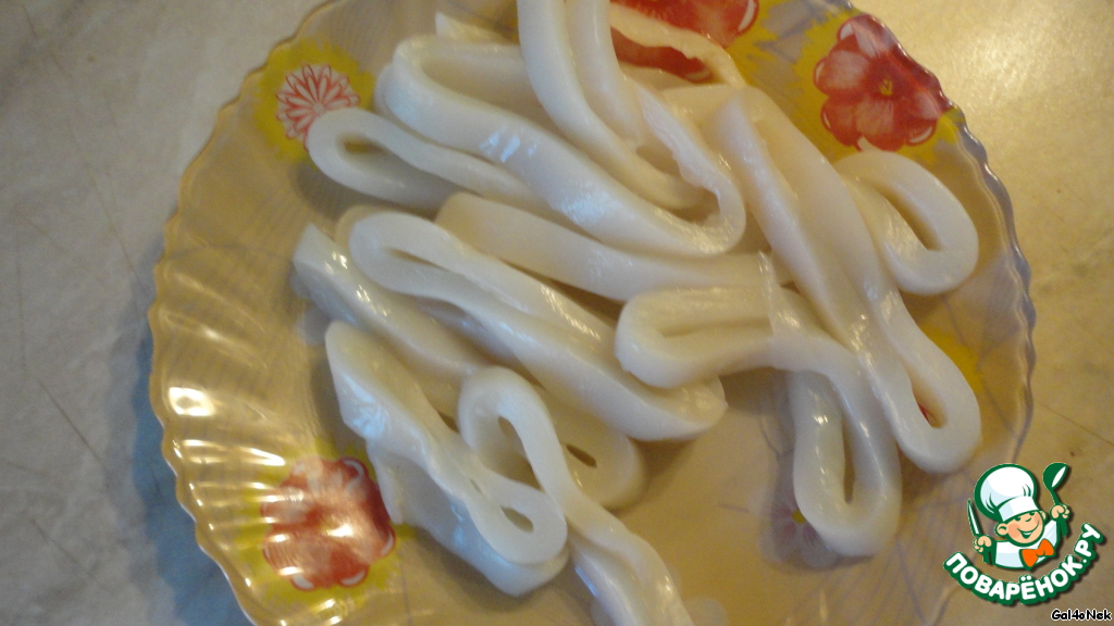 Сначала нужно ПРАВИЛЬНО разморозить кальмар. Идеальный вариант - поставить вечером на тарелке в холодильник. Утром он будет "готов". Можно размораживать при комнатной температуре, но тогда за ним надо будет постоянно следить. Ни в коем случае не заливайте теплой водичкой, чтобы ускорить разморозку. Такой прием сделает кальмара размазней.