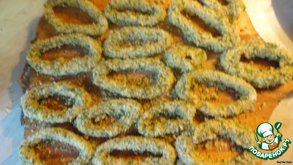 Окунаем каждое колечко в яйцо и обваливаем в панировке. После чего кольца нужно поставить минут на 15-30 в холодильник, чтобы панировка подсохла и не обсыпалась при жарке. Так получилось, что у меня они стояли полдня.