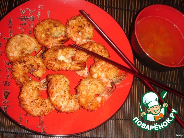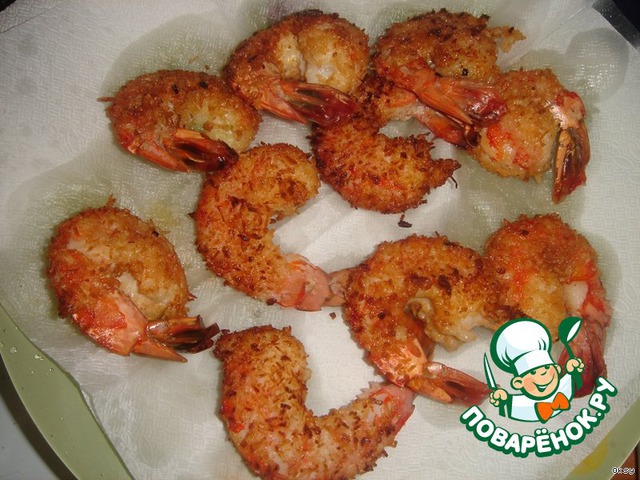 Необходимо взять белки яиц и слегка их взбить вилкой. В рецепте дается аж 4 белка. Этого много. Мне на 10 креветок вполне хватает белка 1 яйца, на 20 хватит и 2 белка. Так вот, креветки нужно накалывать на вилку или деревянную шпажку, окунать в белок, а затем обмакивать в кокосовой стружке. С кокосом авторы рецепта тоже погорячились. У меня пакетик 40 г, так еще осталось. То есть, на 20 креветок одного пакетика хватит.
