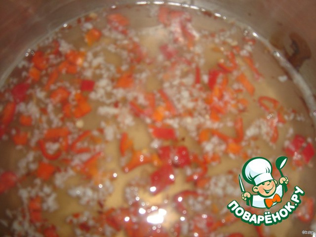 Для этого нужно измельчить чеснок, растолочь перец чили (у меня был свежий, поэтому я добавила только один стручок, мелко его порезав), переложить в кастрюльку.