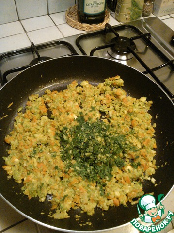 Добавить измельчённую петрушку, посолить-поперчить. Можно также добавить 2 листа измельчённого свежего базилика.