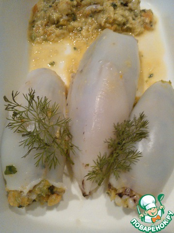 Наполнить фаршем кальмары. И поместить их, в смазанном растит. маслом противне (или др. сответств. ёмкости), в духовку, разогретую до 180 С на 15 минут, предварительно накрыв противень фольгой.