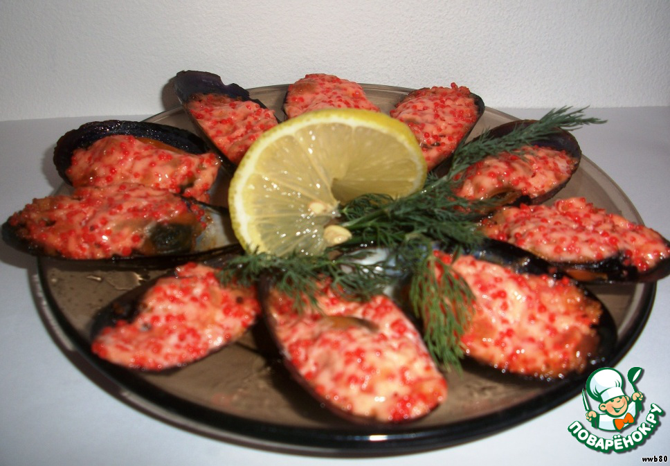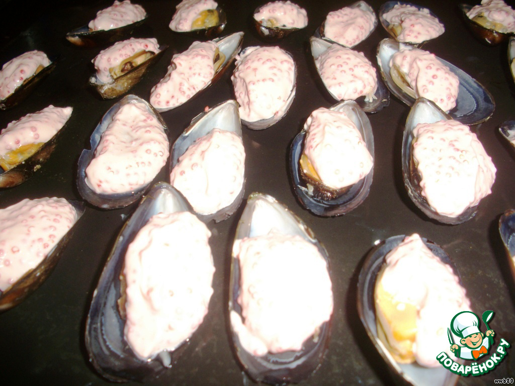 Выложить смесь сыра с тобико на мидии и отправить в разогретую духовку на 5 минут.
