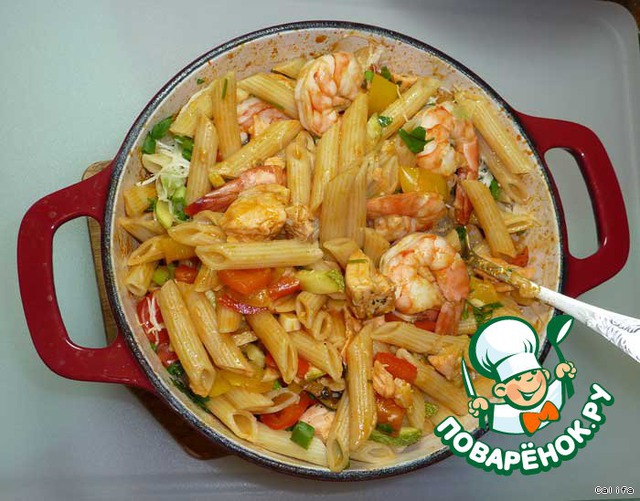 В толстостенную латку налить масло, бросить чеснок, поджарить чуть золотистого цвета и приятного аромата, не пережечь. Добавить перец и кабачки, можно добавить 6 -8 шампиньонов. Слегка обжарить. Влить томатный соус и столько же горячей воды. Дать закипеть, убавить огонь и протушить минут 7. Когда соус загустеет, положить рыбу порезанную кубиками 2 -3 см, хорошенько перемешать. Добавить огонь. Затем креветки, тоже все хорошо перемешать. Выложить уже сварившиеся макароны. Если соуса маловато, можно добавить воды от макарон. Все должно быть достаточно сочным и покрыто соусом. Добавить лук и петрушку. Выключить огонь. Все делать ОЧЕНЬ быстро. Рыба и креветки не должны быть на огне больше 3 минут. Засыпать сыром и перемешать. Сверху полить оливковым маслом.