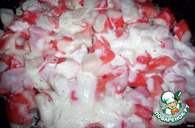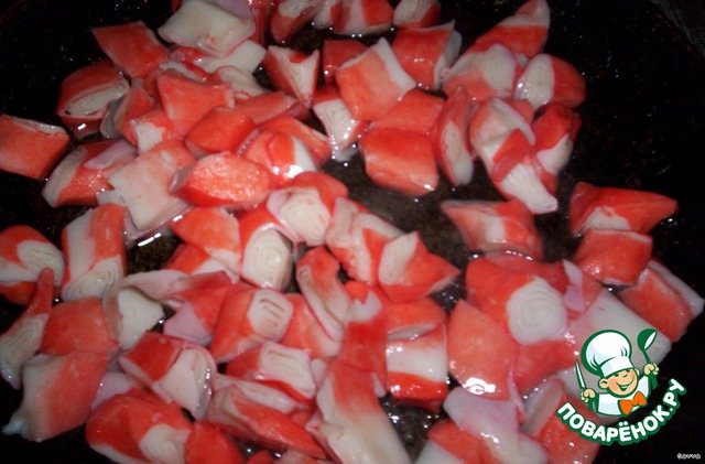 Крабовое мясо обжарить (прогреть) на сковородке с разогретым подсолнечным маслом