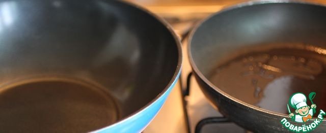Ставим на огонь 2 сковороды, либо готовьте в одной поэтапно. В ресторанах используют горячие плоские плиты тепан. В домашних условиях лучше использовать сковороду вок. И так, в одной разогреваем растительное масло, во второй кунжутное.