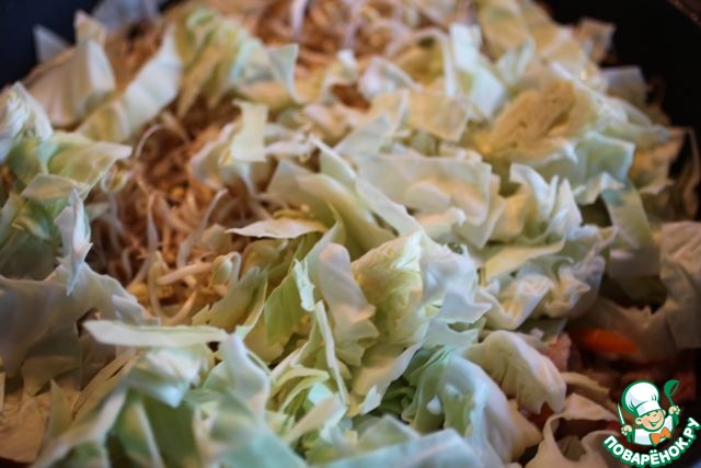 Порезать лук, перец и морковь вот так. Вообще вариаций добавлений овощей множество. Как в японской, так и в китайской кухне нет никаких ограничений. В оригинале это капуста, лук и проростки. В Китае чаще используют китайскую капусту, а в японском белокочанную.