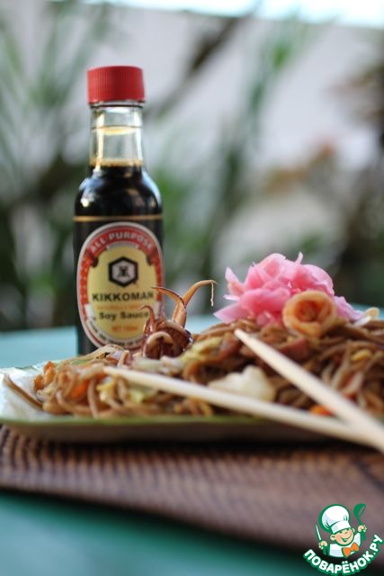 Далее добавляем лапшу и вливаем соус. Жарим еще 5 минут. Хорошо все размешивая. Так, чтоб все хорошо перемешалось и пропиталось соусом. Попробуйте, если вам чего то не хватает, например: остроты или соли. Добавьте, но не солите солью, а добавьте соевый соус. Украшают блюдо маринованным имберем и бонито хлопьями. Они у меня закончились, но на фото не было бы видно их волшебного движения. Так как, когда они попадают на горячие, начинают двигаться, как крылышки бабочек. В каждом населенном пункте Японии готовят это популярнейшее блюдо, и везде по-разному, с использованием различными видами лапши, своих ингредиентов, приправ и бабушкиных рецептурных секретов.