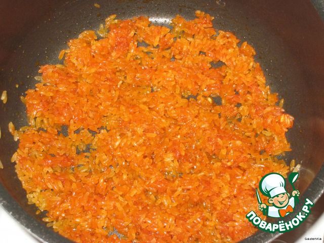 В посуду, где будут готовится рис с мидиями, положить примерно 1 ст.л. растительного масла и томатную пасту, довести до горячего состояния, всыпать рис и немного обжарить рис, до полупрозрачного состояния.