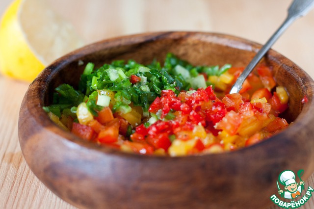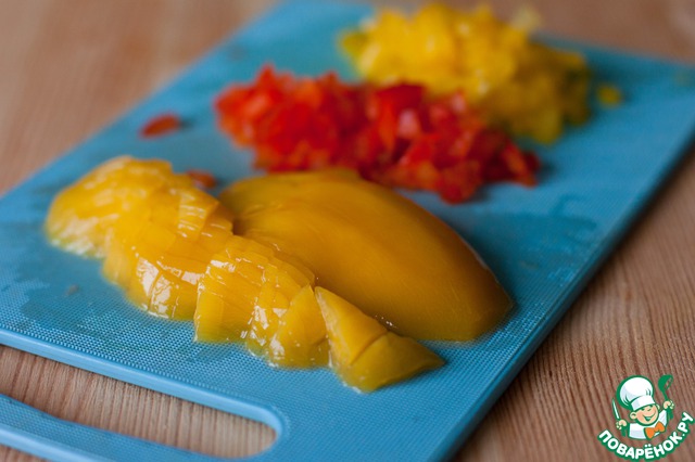 А пока приготовим сальсу - мелко нарезать оставшийся перец и манго (у меня консервированный). Манго можно заменить персиком или нектарином.