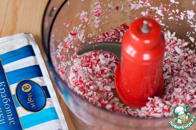 Крабовые палочки нарезать мелко или измельчить при помощи комбайна. Не до фанатизма! Важно, чтобы оставались небольшие кусочки.