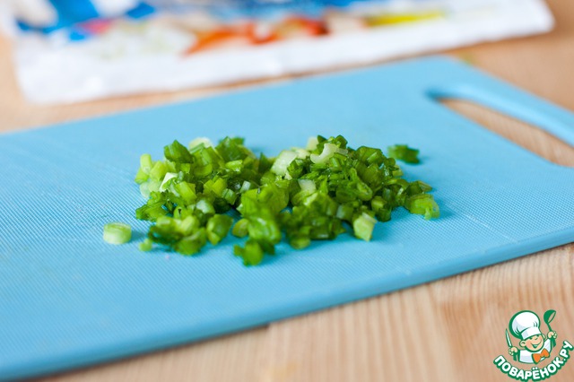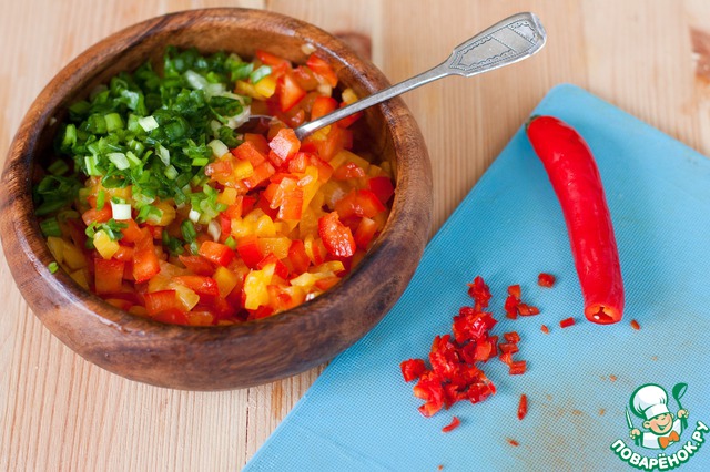 Смешать манго, красный и желтый перцы, добавить нарезанный зеленый лук и перец чили.