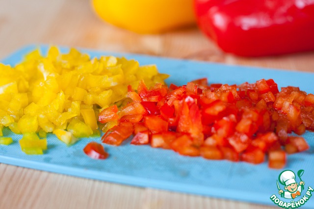 По четвертинке красного и желтого перцев нарезать мелкими кубиками.