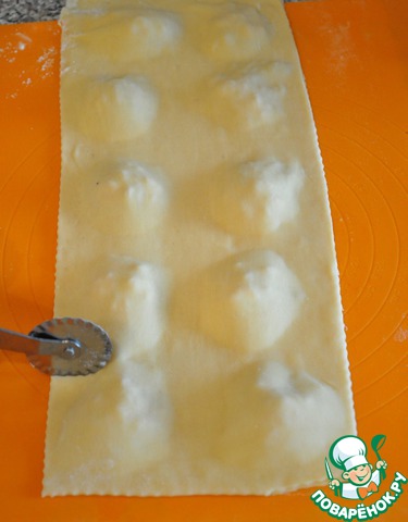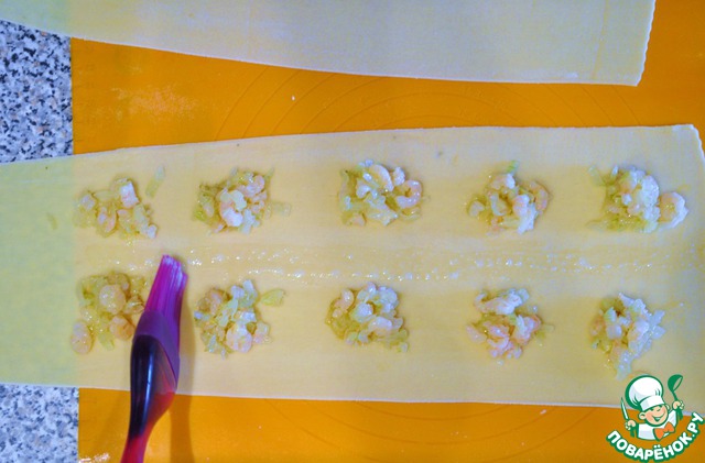 Выкладываю начинку. Смазываю края для склеивания взбитым яйцом.