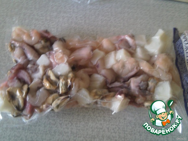 Морской коктейль кладем в горячую подсоленную воду, как закипит - засекаем 1-2 минуты.