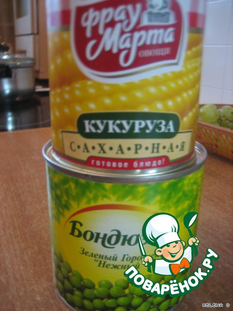 Можно взять, как у меня, по-1/2 больших банок кукурузы и горошка.