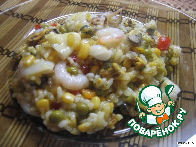 На сковороде смешиваем все ингредиенты (зажарку, рис, морепродукты, горошек, кукурузу и приправы) и... ВСЁ, готово!!!