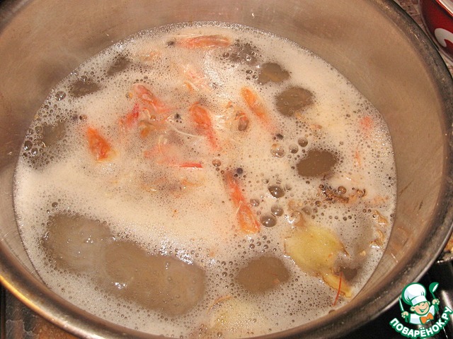 Креветки очистить от панциря и голов ( удалить кишечную вешу), отложить в сторону. Панцирь и головы положить в воду, добавить ломтики имбиря, цедры с лайма, варить бульон в течении 7-8 мин. Бульон процедить.