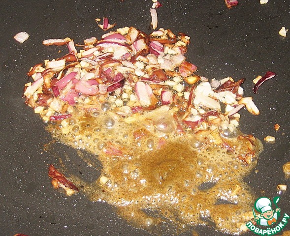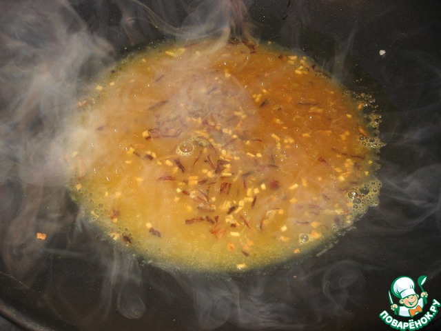 Разогреть в воке растительное масло и обжарить лук и чеснок. Добавить пасту карри продолжать жарить мин 2-3.