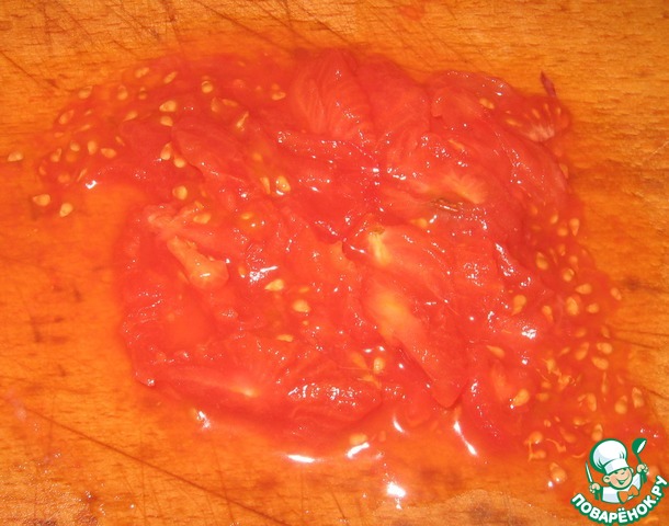 Ошпарить кипятком помидоры и снять кожицу. Порезать тонко.