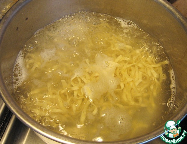Отварить яичную лапшу согласно инструкции на упаковке, слить воду.
