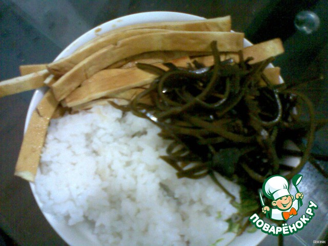 порезала его вдоль, рис и водоросли. Соус - соевый!!!