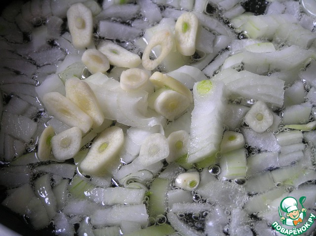 Приготовить начинку. Лук и чеснок нарезать, обжарить на растительном масле до мягкости.