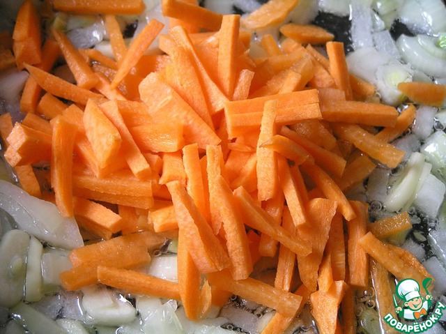 Добавить нарезанную соломкой морковь, продолжая обжаривать.