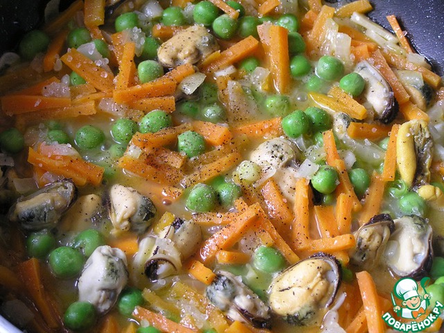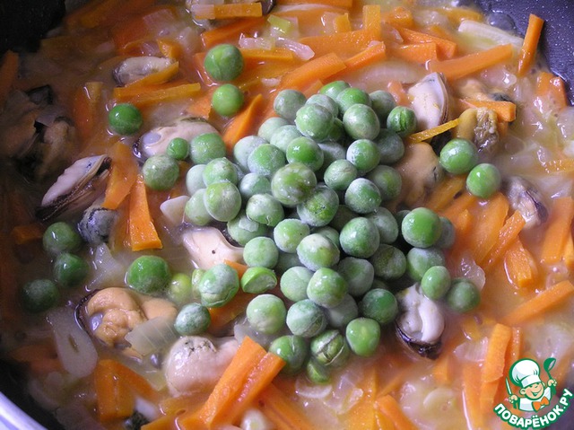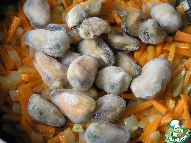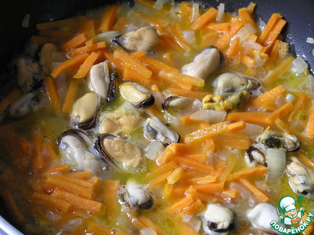 Добавить мидии (можно не размораживать), готовить 3-4 минуты, пока не разморозятся.