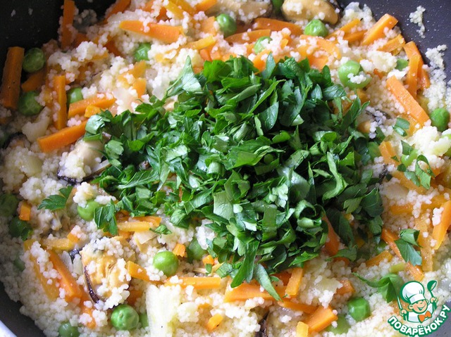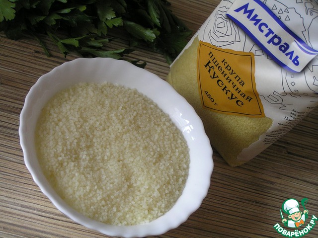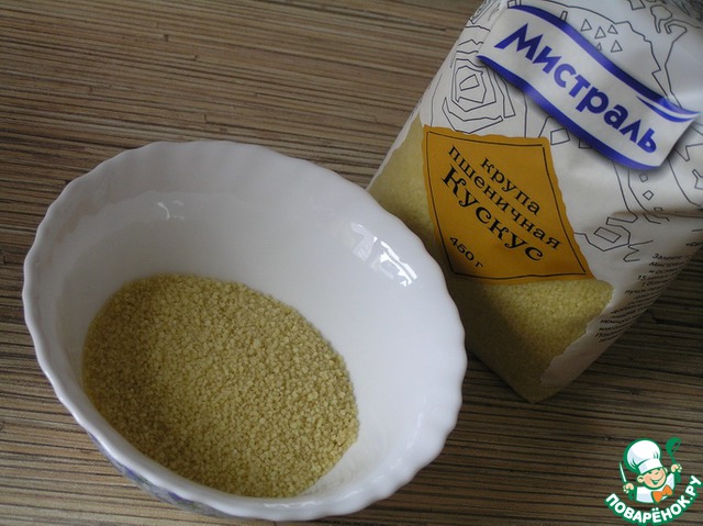 Тем временем вскипятить воду 200 мл и залить кус-кус, перемешать.