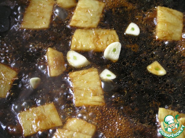 Приготовить соус. В сковороду влить мартини, довести до кипения, затем влить соевый соус, добавить крупно нарезанный имбирь и чеснок. Готовить, помешивая, 3 минуты. Затем всыпать сахар и влить крахмал, разведенный в 1 ст. л. холодной воды, перемешать.