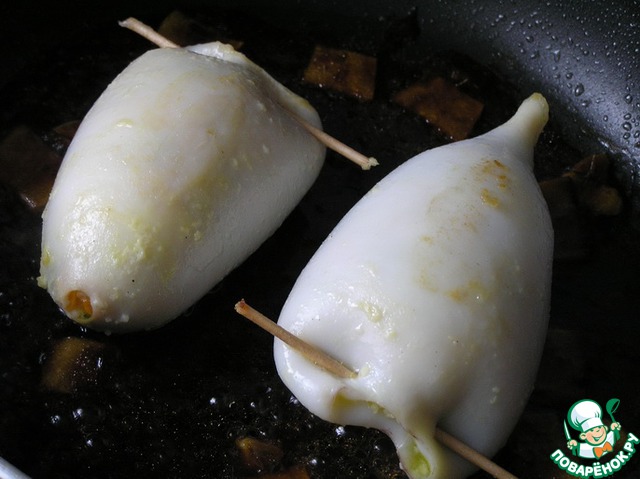 Нафаршировать начинкой, закрепить отверстия деревянными шпажками. Затем обжарить на растительном масле по 30-40 секунд с каждой стороны.