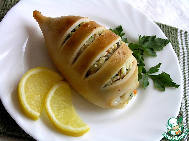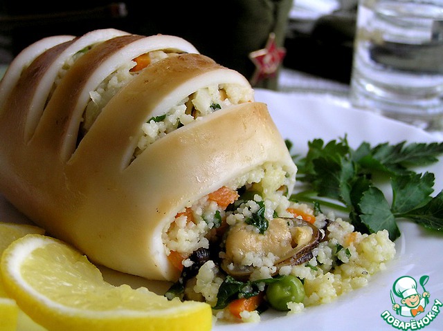 Кальмары, фаршированные мидиями, овощами и кус-кусом