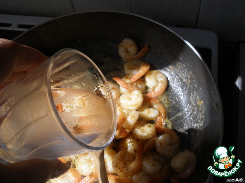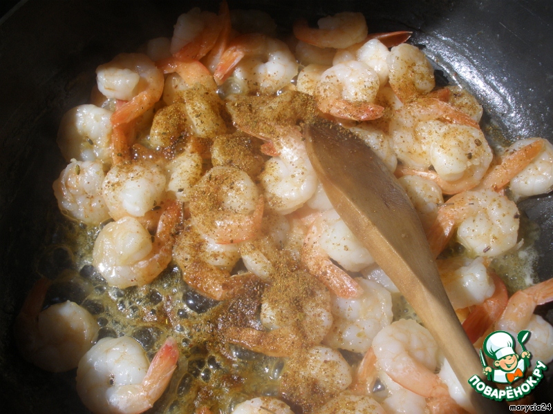 Наливаем на сковородку масло и добавляем чеснок мелко нарезанный, потом добавляем креветки и продолжаем пережаривать, помешиваем, пока не испарится вода, добавляем специи.
